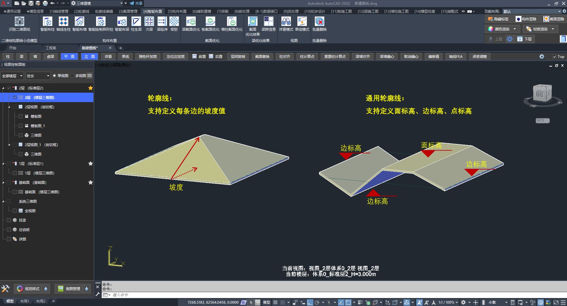 构件可吸附在轮廓线上,用户只需设置轮廓线的标高信息,即可实现批量调整构件标高的效果。