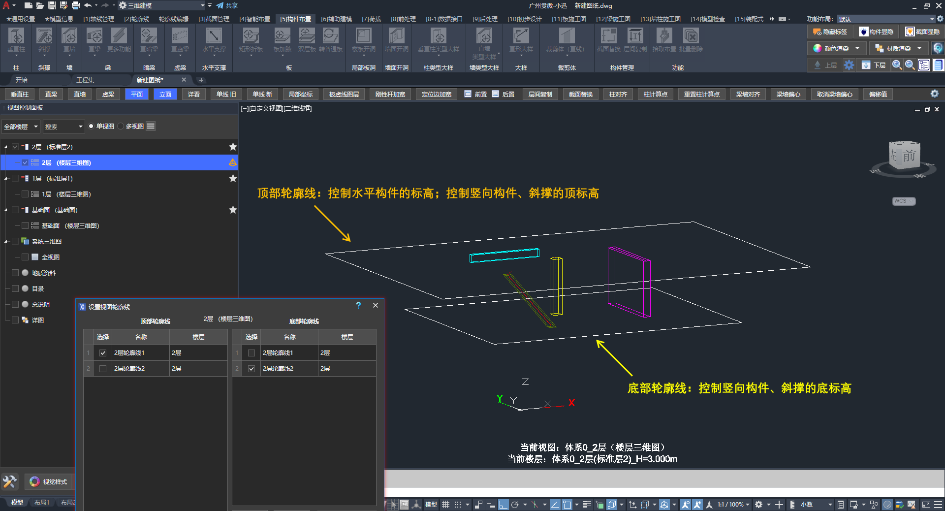 - 设置视图顶部轮廓线、底部轮廓线后,再布置杆件