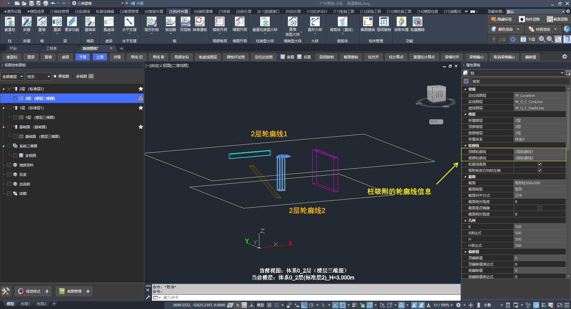 柱吸附在轮廓线后的属性面板信息