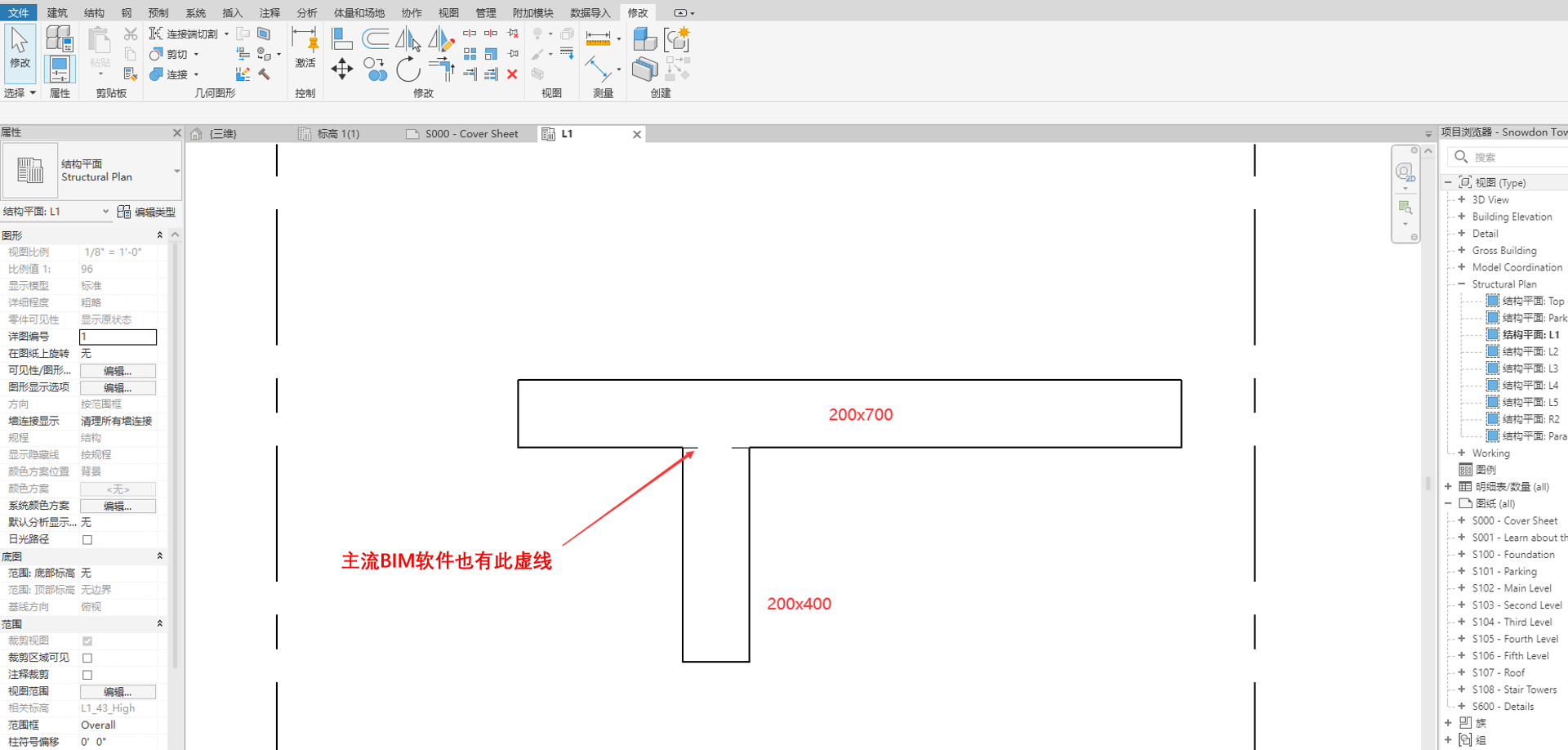 当主次梁的梁高不同时,会自动生成交界处的隐藏线。
