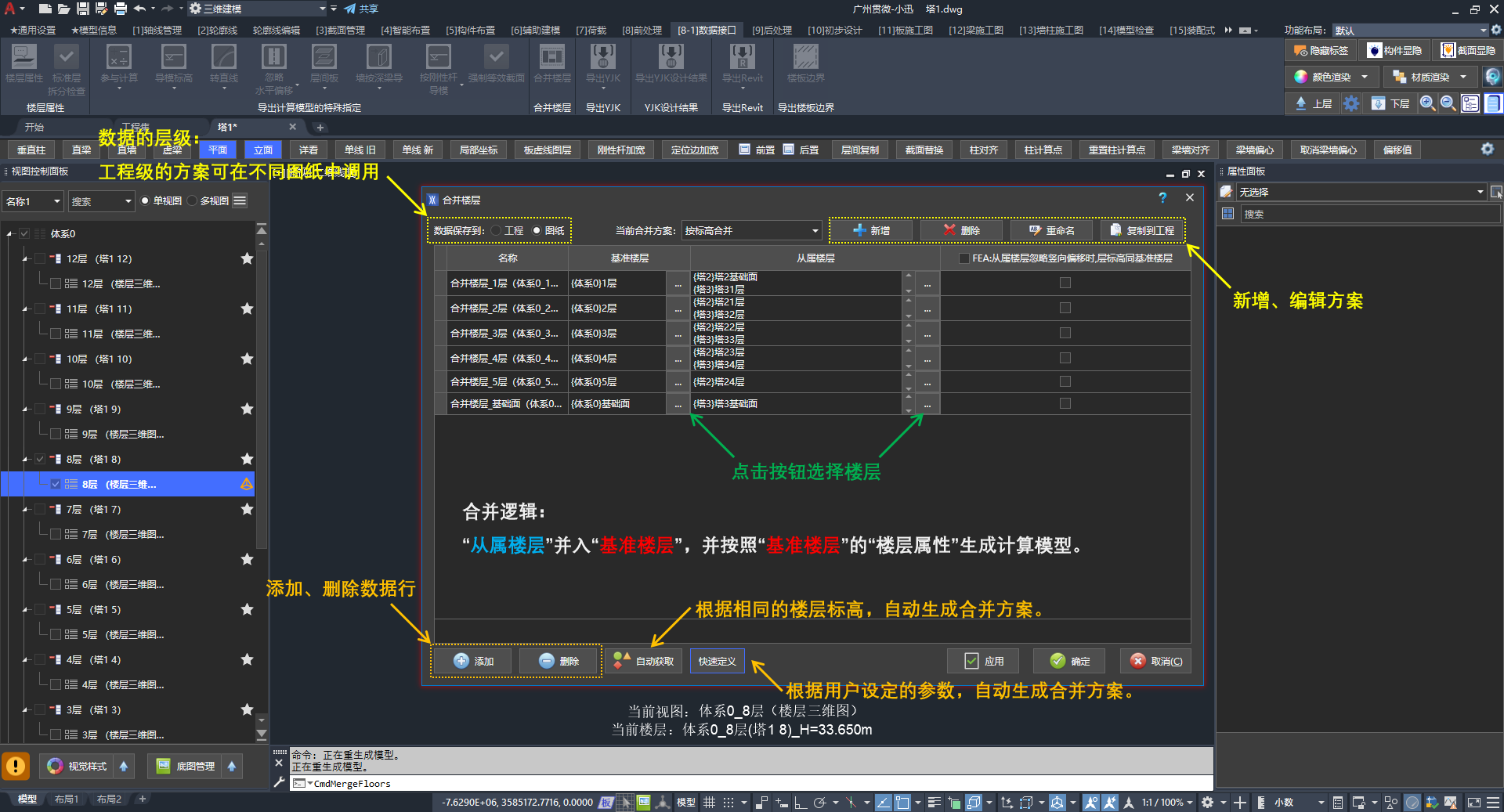 - 第一步:定义“合并楼层”方案,需注意区分方案层级(工程、图纸)。