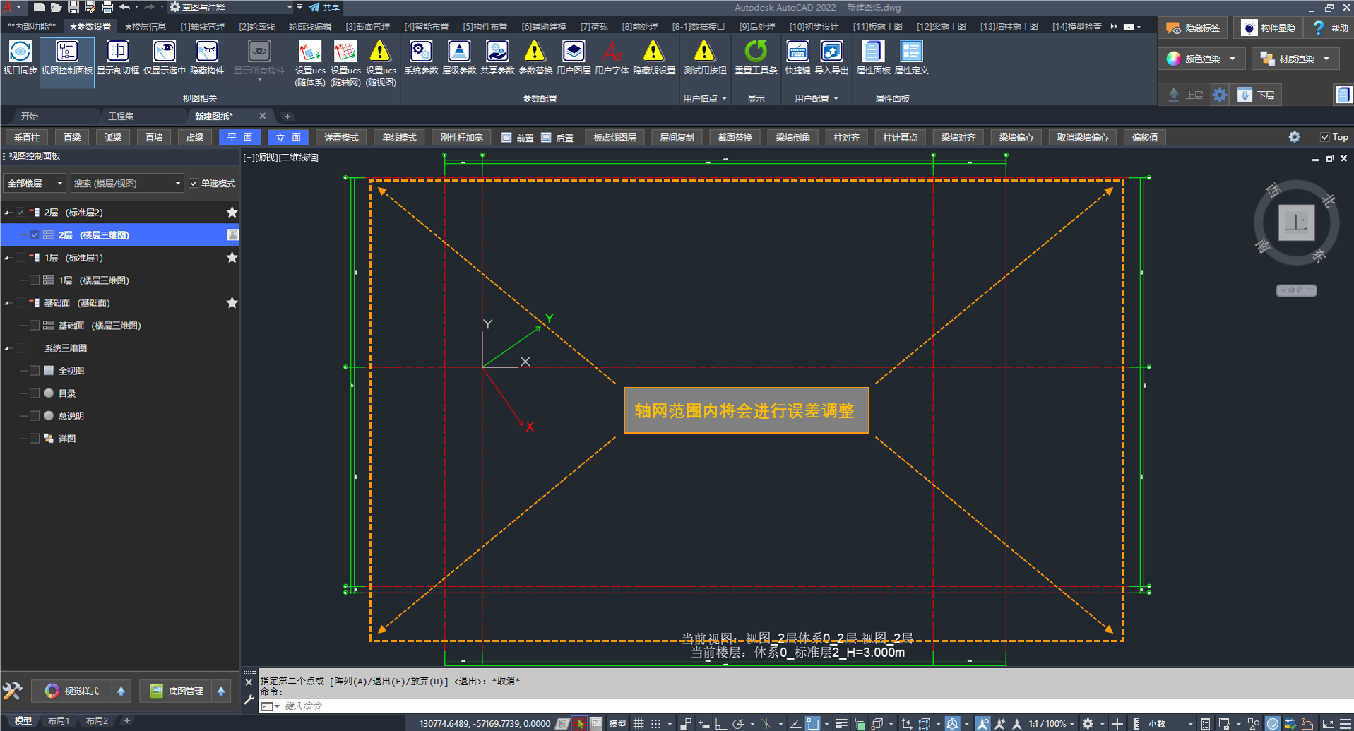 轴网中的轴线会根据"轴网基点"和"X轴方向"进行误差调整。